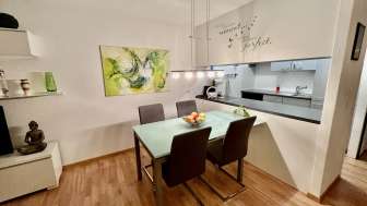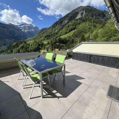 The 3 1/2-room terrace apartment in Valens offers a quiet location with panoramic views of the Tamina Valley. It is modernly furnished and has a large sun terrace, a fully equipped kitchen and free WLAN.