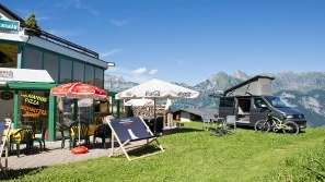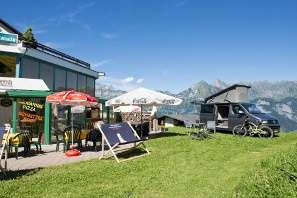 BikerCamping Flumserberg offers overnight accommodation directly at the valley station of the 12-seater Prodalp-Express gondola lift in Tannenheim. Campers can use the infrastructure of the Aparthotel Edy Bruggmann and stay overnight close to the BikerTrails.