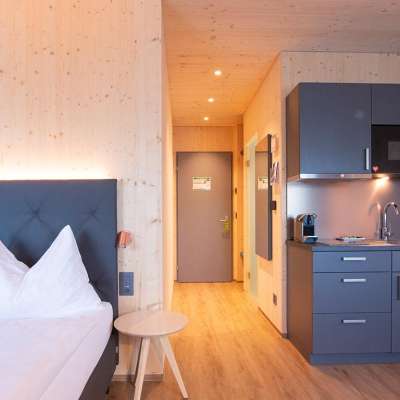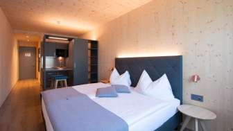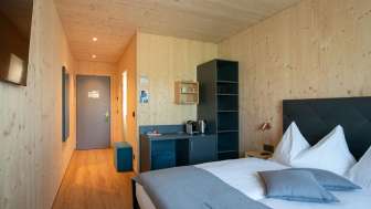 The Cubilaris is a new innovative motel consisting of 20 wooden room modules. You have the choice of staying in a Cubi Classic (19 m2) or a Cubi Studio (24 m2). All room modules are comfortably and modernly furnished. The Cubi Studio has a small kitchen, a dining and lounge area and a larger bathroom. You can reach the motel by car or public bus (right outside the door). A charging station has been available for electric vehicles since 2021. Motorcyclists and cyclists will find a covered carport for their two-wheelers.