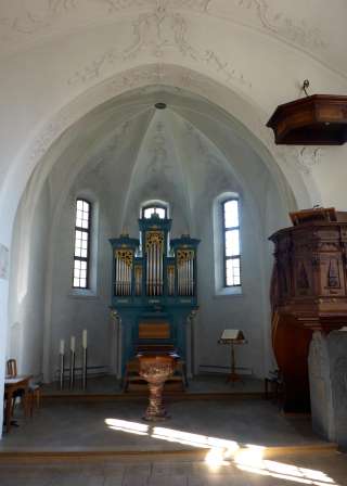 The Protestant church in Malans, with its slender church tower and late Gothic nave, displays grave inscriptions from the noble families of Gugelberg, von Planta and von Salis. The interior is in a simple late baroque style.