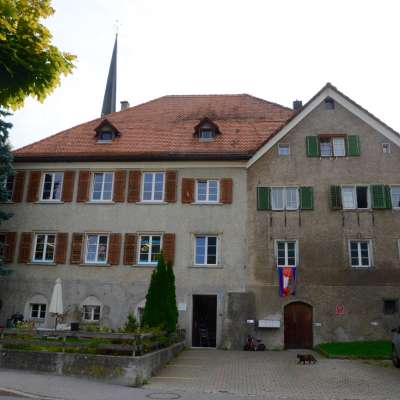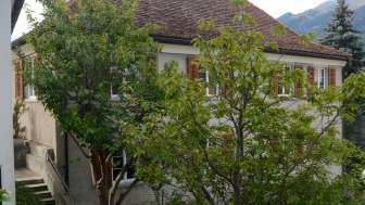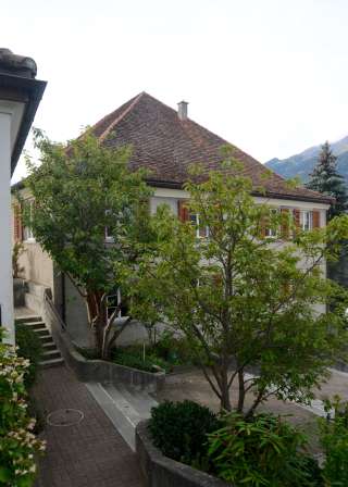 The Protestant parish hall in Zizers is a cubic, palazzo-like building with a flat hipped roof. It houses the parish office and a playgroup. The building leads to the church via a spacious staircase.