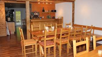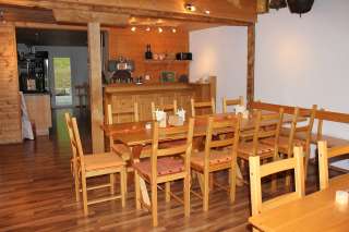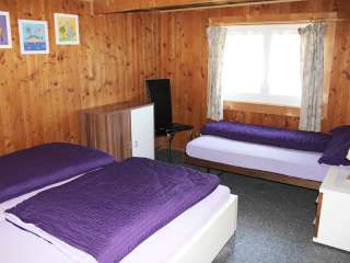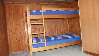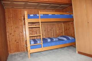 The homely vacation home is cozy and comfortable, furnished with lots of wood. The walls in the living room and bedroom are paneled.