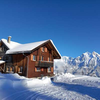 The Pfadiheim Sunnebode is located in the beautiful recreational area of the Flumserberge 1200 meters above sea level. It is in a quiet, traffic-free location with a wonderful view of the Seeztal valley and the neighboring Churfirsten mountains. The house was renovated and rebuilt in 1995.
