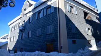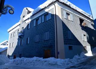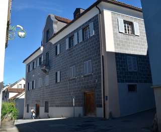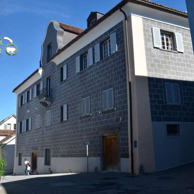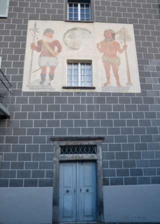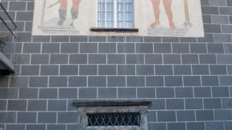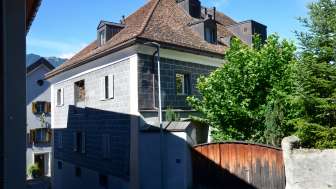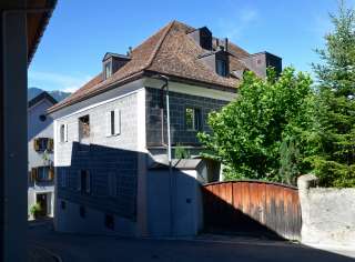 The imitation ashlar painting on the façade, the first row of windows high above the alleyway and the hipped roof above the massive body show that this is a manor house. Above the ornamental balcony, a gable is harmoniously enthroned, reminiscent of local building culture. But Wildmannli on the west façade teaches you that you were at home in the Zehngerichtebund.