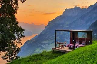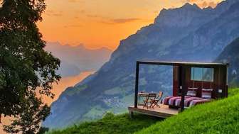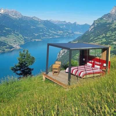 On a wooden platform, covered by a pergola that keeps out the rain, you sleep on a waterbed protected from the wind by a glass wall. In the middle of a flower meadow with a view of Lake Walen & the Sarganserland, you can enjoy the breathtaking view & the fresh mountain air at 1300 m above sea level. If it storms or rains heavily, you can spend the night in the mountain inn. You can also use the shower and toilet in the mountain inn (approx. 30 m away). If you are hungry in the evening - have a delicious dinner on our cozy terrace. We prepare all dishes with love on the wood stove.