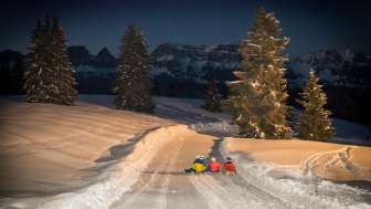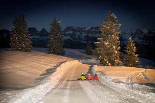 Night sledging takes place on Thursdays and Saturdays. The floodlit piste from Prodalp to Tannenheim offers exceptional moments in the snow. Between 7 p.m. and 9 p.m., young and old alike get on their sledges for a descent. And as the piste is specially prepared for this night-time event wherever possible, great fun is guaranteed for the whole family.