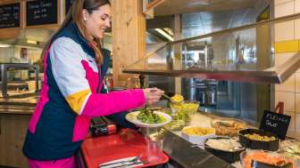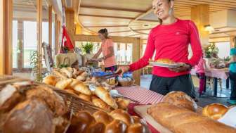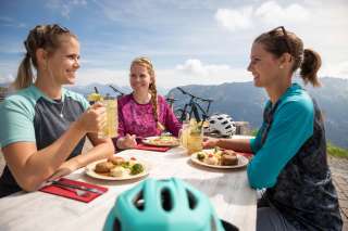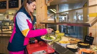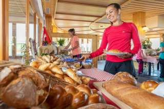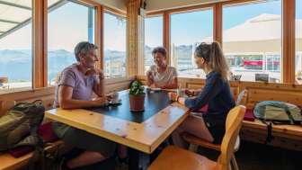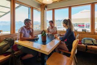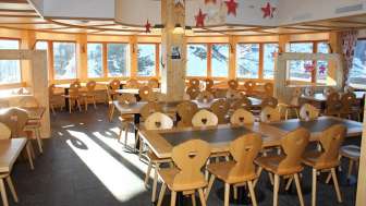 The bright round building has 80 seats. In the spacious hall, 240 guests can enjoy the view of the Churfirsten and the cozy Stübli offers 48 seats with the best view of the Spitzmeilen area. On the huge sun terrace, 600 guests can marvel at the breathtaking panorama at the same time (200 seats). Sun loungers are also available.