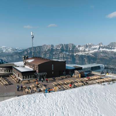 Enjoy the panoramic view of the surrounding mountains from the highest restaurant on the Flumserberg. On one side, let your gaze wander relaxed over the expanse of the Spitzmeilen area with its characteristic landmark, the 2501 m high Spitzmeilen, or on the other, be enchanted by the magical Churfirsten and Alvier ranges with their jagged peaks high above Lake Walen.