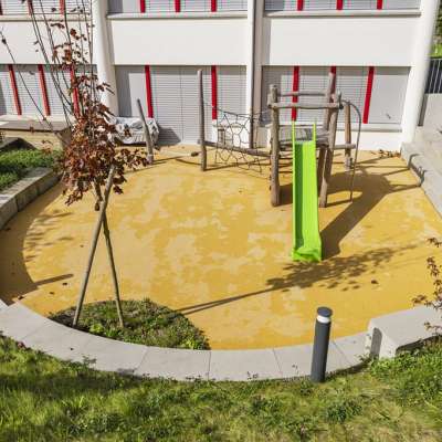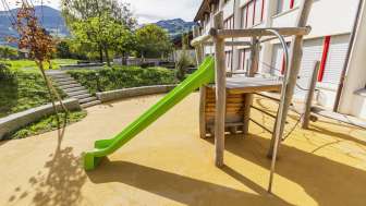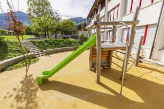 The Camilu School Berschis playground offers a slide and climbing elements for younger children in a small space. An ideal place for a short, fun break outdoors.