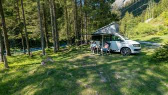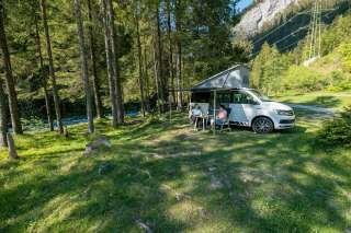 The campsite is in a quiet and natural location right by the river, around 5 minutes' drive from the village of Vättis. It offers space for a total of 6 vehicles - suitable for motorhomes, vans, caravans or even tents.