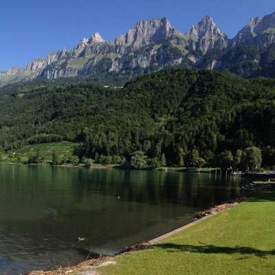 In addition to a pebble beach and a spacious sunbathing lawn with lots of trees, the bathing facility in Walenstadt offers a diving platform (3m) and a raft in Lake Walen. Toilets, showers, lockers and changing rooms are available at the "Neptun" beach restaurant right next to the beach. There is no lifeguard on site, swimming is at your own risk. The beach section in Walenstadt is freely accessible at all times. The Neptun beach bar is open in the summer months from April to October, depending on weather conditions. The Walensee Schifffahrtsgesellschaft boat landing stage is right next door, as is the "Walenstadt, Hafen" bus stop. Walenstadt railroad station is around 500m away. Drivers will find paid parking spaces right on the beach.